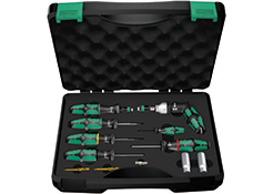 1把可调式扭矩螺丝刀4.0-8.8Nm,枪形手柄;1把预制式扭矩螺丝刀3.3Nm;1把预制式扭矩螺丝刀1.4Nm TX 10;1把预制式扭矩螺丝刀1.25Nm TX 10;1个valve dolly;1个批头867/4 HF TX 15x50mm,可固持TORX®梅花螺丝;1个批头867/4 HF TX 20x50mm,可固持TORX®梅花螺丝;1个套筒790 A/50 SW 12.0x50mm;1个转接头870/1,¼"六角转接¼"四角;1个阀门插入工具,预设扭矩0.25Nm;1个阀门插入工具,预设扭矩0.45Nm