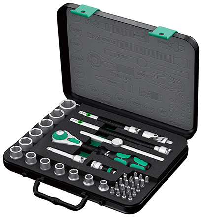 1把3/8"驱动的Zyklop棘轮扳手,12个英制Zyklop套筒,2个带自由旋转护套和快速锁定装置的Zyklop延长杆(长短各一件),1个T型滑动手柄,1个摆动延长杆,1个万向接头,1个带快速接头的转接头,19个批头