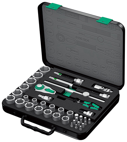 1把1/2"驱动的Zyklop棘轮扳手,18个英制Zyklop套筒,2个带自由旋转护套和快速锁定装置的Zyklop延长杆(长短各一件),1个T型滑动手柄,1个万向接头,1个摆动延长杆,1个带快速接头的转接头,13个批头