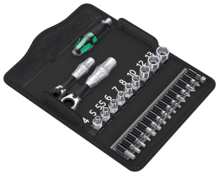 1把维拉批头用棘轮扳手Zyklop Mini 1,通体全钢锻造,用于DIN ISO 1173-C 6.3和E 6.3标准的1/4"六角批头,以及维拉系列1和4的批头。也可通过维拉870/1转接头接驳1/4"套筒。1把Zyklop Mini 2棘轮扳手,通体全钢锻造,适用于维拉8790 FA套筒。9把维拉8790 FA套筒,1个870/1驱动转接头,14个批头,具有韧性,通用型