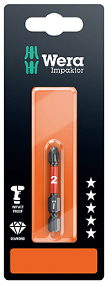 设计:冲击技术可确保产品在极端条件下也具有超长的使用寿命,因为其充分利用了材料特性,优化了几何设计,尤其适合与传统的冲击螺丝刀一起使用。坚固的金刚石涂层可降低螺丝头因摩擦阻力增强而滑出的风险。带“易寻”色标系统:通过颜色标识(红色=十字)和尺寸标示可轻松找到所需批头